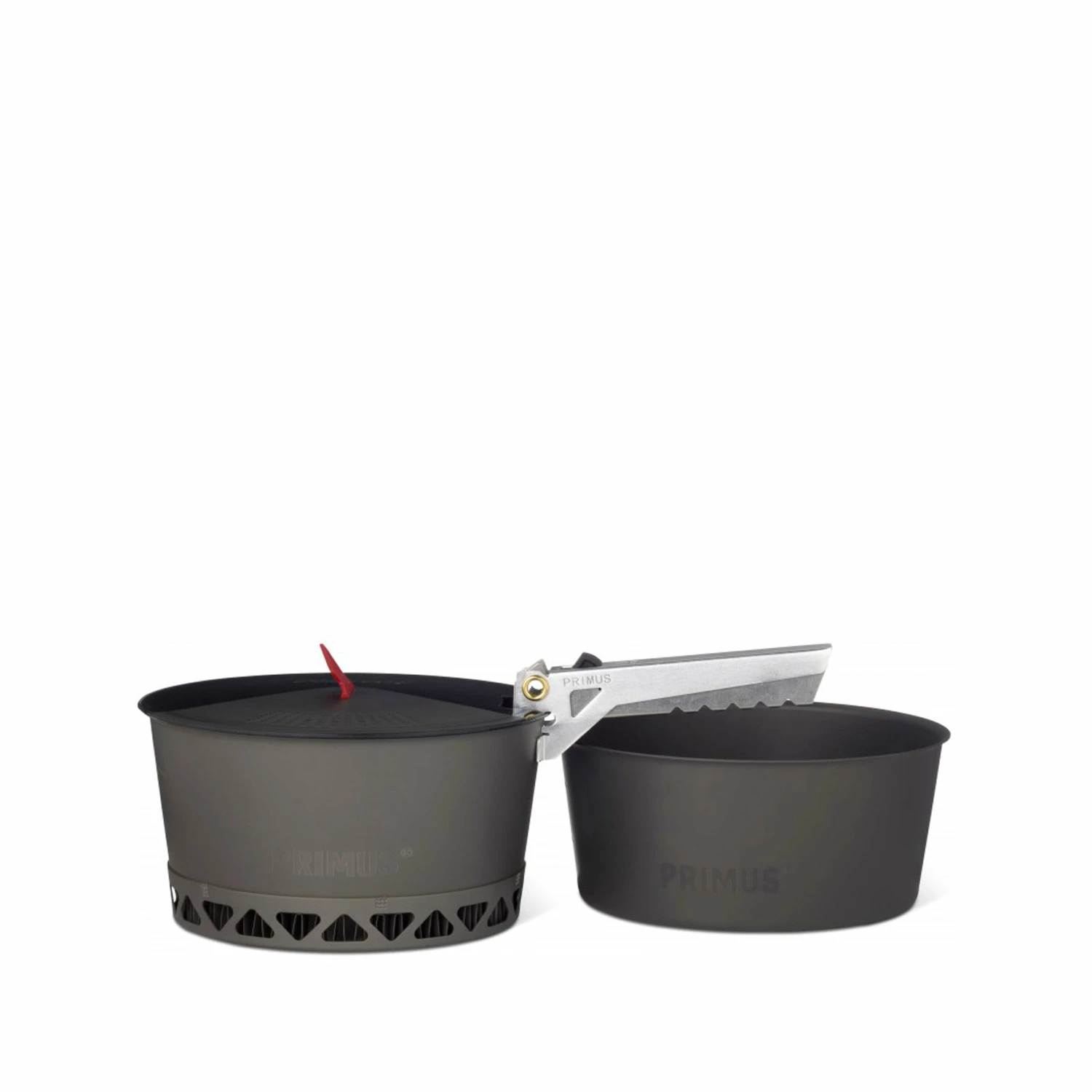 The PrimeTech pot is made of hard anodized aluminum, which has good heat distribution and does not rust. It also has a ceramic non-stick coating on the inside, which facilitates the cooking and cleaning. The second pot is made of hard anodized aluminum, with a traditional design without heat exchanger. Both of the pots are 1.3 liters, good for 1-3 people. A transparent lid in Tritan reg; with an integrated strainer and heat-resistant silicone handles which make it easier to take care of certain tasks such as pouring pasta water. The smart gripping tongs are as steady as a fixed handle and flexible as a conventional gripper and can be locked in the pan for easy and safe handling. Our Prime Tech pots work well with all of our stoves.