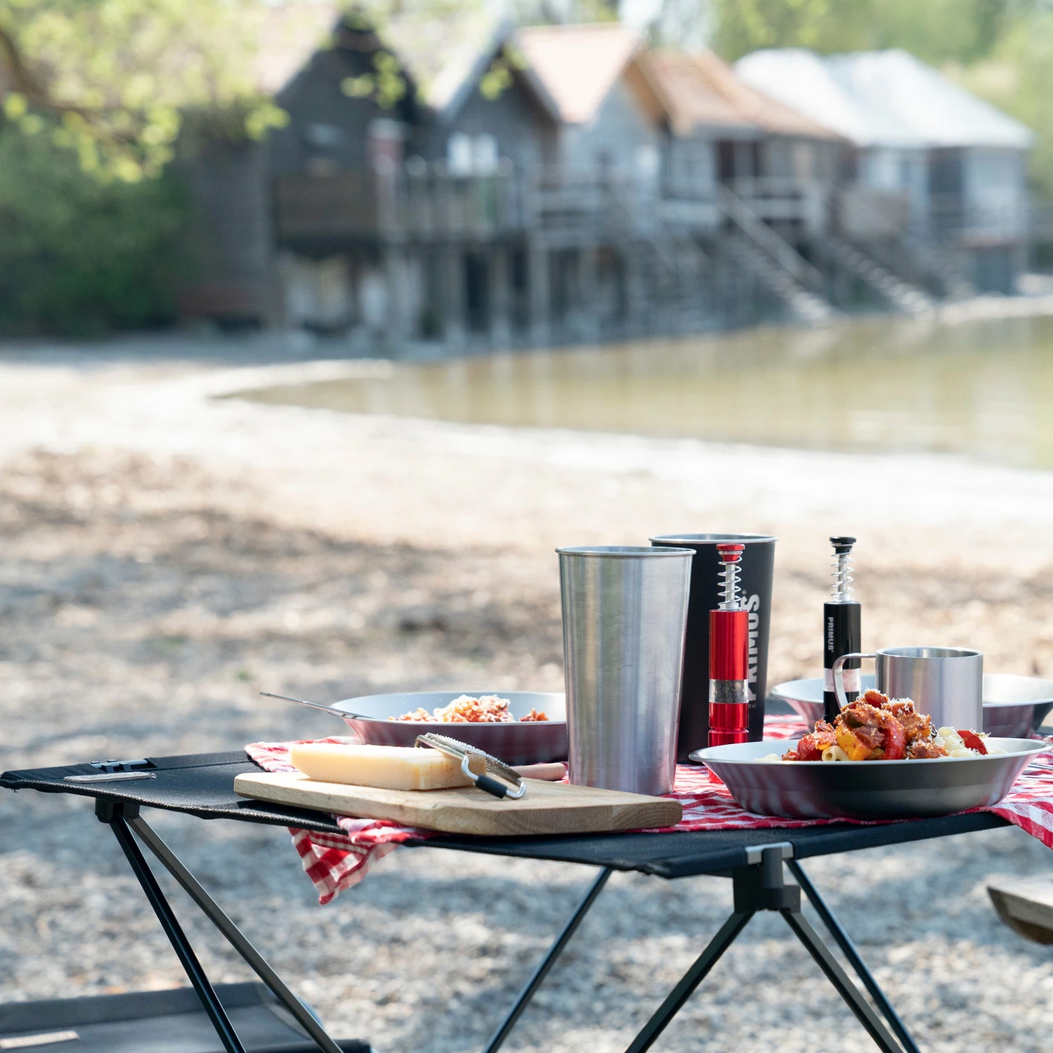 Give your outdoor cooking some extra flavour. A set of a salt and pepper mill made of durable aluminum. Easy to operate with just one hand.