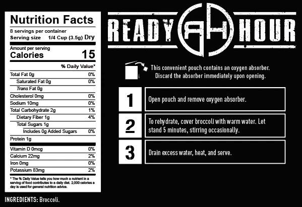 Ready Hour Freeze Dried Broccoli is an excellent addition to any food supply plan. Add it to your favourite casseroles, keep on hand for that last minute vegetable item should the need arise where you cannot get to a grocery store. So many uses for broccoli, you can garnish with it, pack a snack, or serve as a side dish. All of our products have a long-lasting shelf life. Our Broccoli lasts up to 30 years unopened, and one year once you open the can. Store it in a cool, dry location where temperatures stay between 55 and 75 degrees for optimal longevity.