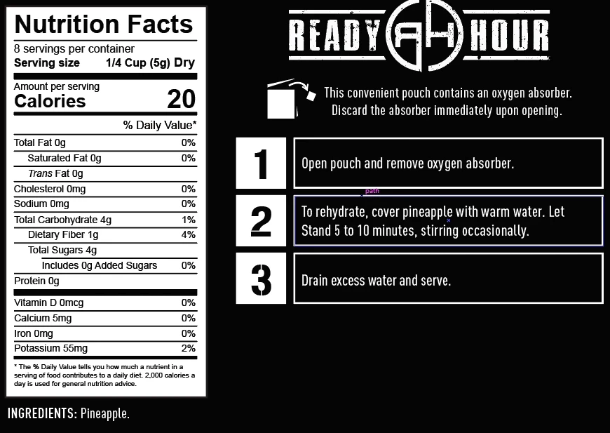 If you are in a crisis situation and there is no access to grocery stores, you still have access to delicious pineapple by Ready Hour. Our Freeze Dried Pineapple makes a delicious and healthy snack, or add it to your pizza, fruit dish, or recipes. Pineapple has excellent healing properties such as: