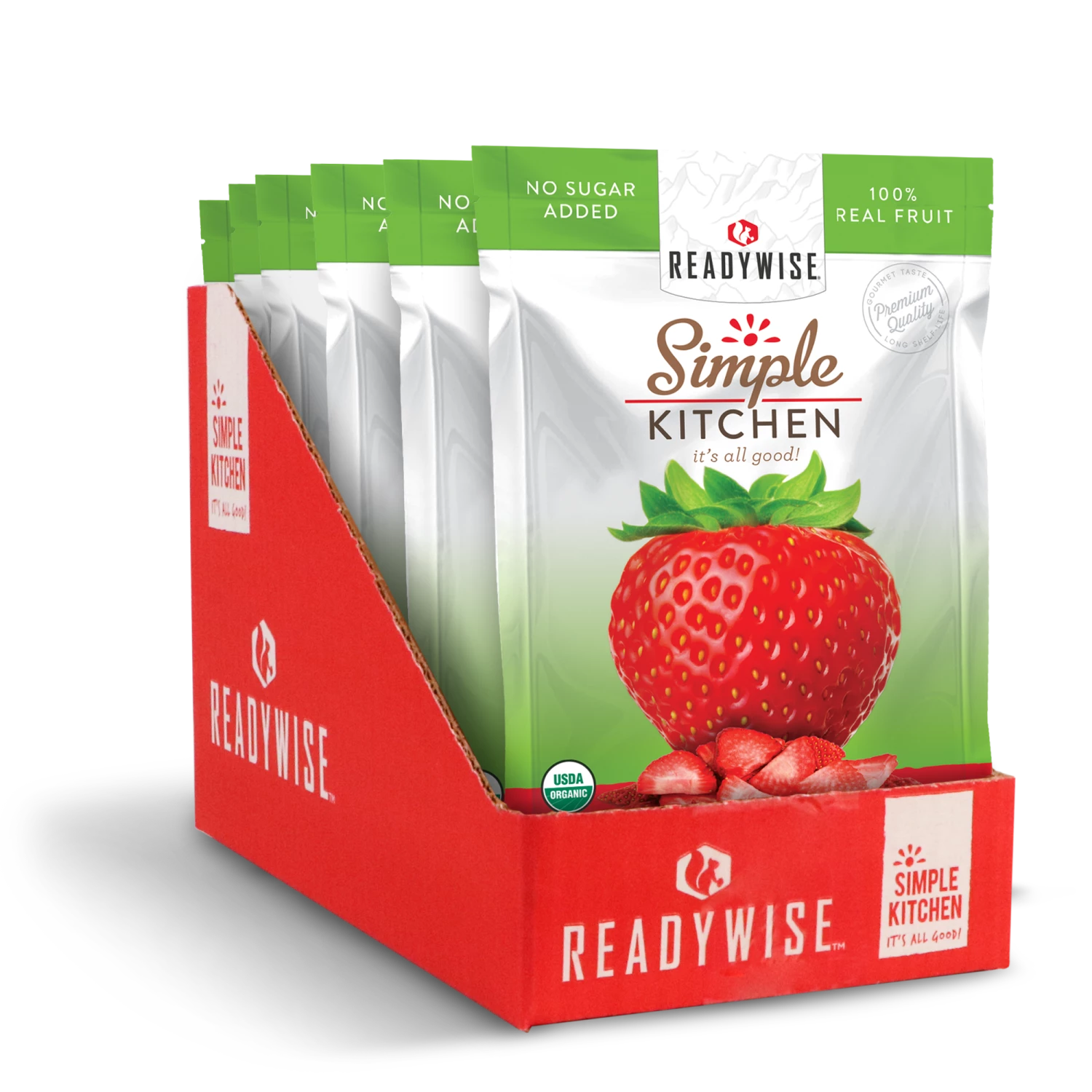 This box includes six pouches of Simple Kitchen’s (a ReadyWise Company brand) freeze-dried organic strawberries. No fake flavours or preservatives.
