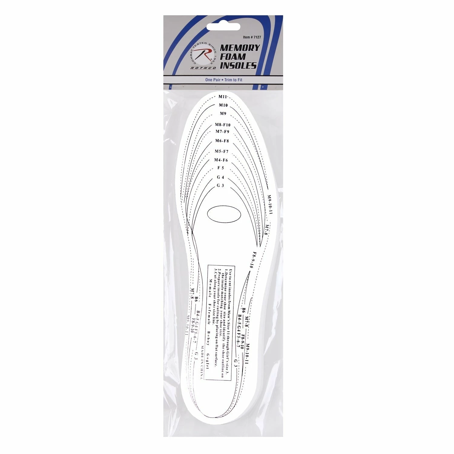 Rothco Memory Foam Insoles feature a 4mm memory foam center with a 1mm white EVA top. The foam insole can be added to shoes or boots for extra comfort and can be trimmed to fit the following shoe sizes: Men 4-13, Women 5-10, Boys 4-6, Girls 3-4.