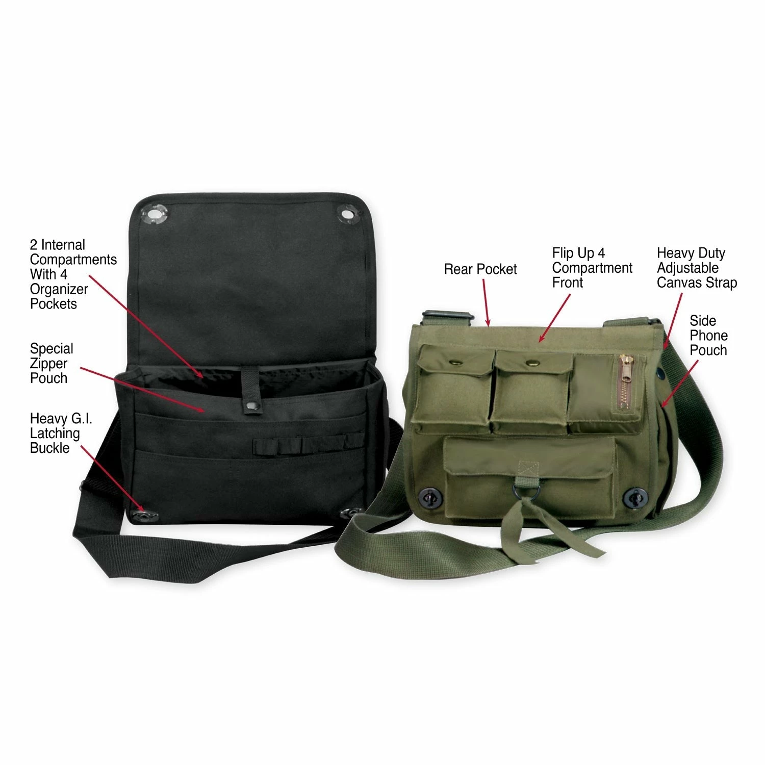 Rothco’s Venturer Survivor Shoulder Bag features a heavyweight Canvas outer and water repellent Nylon interior, a heavy-duty adjustable canvas strap and a GI latching buckle. The bag also features 2 internal compartments with 4 additional organizational pockets, a rear pocket, side phone pouch and 4 flip-up front pouches. The bag measures 10″ x 11″ x 5″ with a 54″ fully extended shoulder strap.