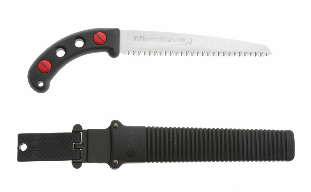 Features rust-resistant, hard chrome-plated, taper-ground blade with an impulse-hardened, non-set tooth design for greater cutting efficiency. Utilizes proprietary Silky MIRAI-ME (Smooth Cutting) Technology – The Teeth of the Future! The precision-ground, razor-sharp teeth with four cutting angles provide fast, clean and extremely smooth cutting action. Great combination of high performance blade with an integrated non-slip cushioned comfort rubber handle that really sticks in your hands. Durable black polypropylene sheath with belt clip is included. Exceptional design, strength, balance and superior finish quality. Ideal for all pruning tasks. Made in Japan. GOMTARO is available in two teeth sizes/configurations (tpi – teeth per inch): 7 tpi – Large Teeth and 11 tpi – Fine Teeth, and five blade lengths: 7-inch (180 mm), 8-1/3-inch (210 mm), 9-1/2-inch (240 mm), 10-2/3-inch (270 mm) and 11-4/5-inch (300 mm).