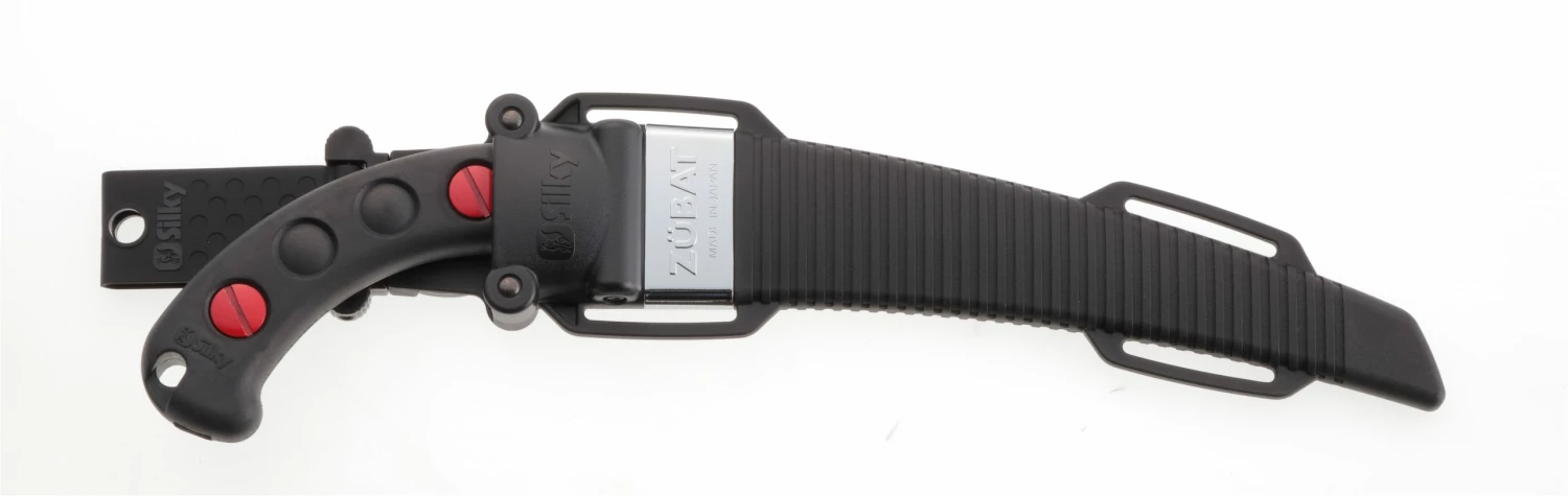Features rust-resistant, hard chrome-plated, taper-ground curved blade with an impulse-hardened non-set tooth design. Curved blade provides greater cutting speed with less effort. Utilizes proprietary Silky MIRAI-ME (Smooth Cutting) Technology – The Teeth of the Future! The precision-ground, razor-sharp teeth with four cutting angles provide fast, clean and extremely smooth cutting action. The hard chrome-plated blade has 6.5 teeth per inch, resists rust and effects of tree resin, and wipes clean easily. Molded-rubber handle holds the high-performance fast-cutting curved blade that fits securely inside its custom-fitted, pivoting, black polypropylene sheath with detachable belt holder. Great combination of high performance curved blade with a comfortable sure-grip handle that really sticks in your hands. Exceptional design, strength, balance and superior finish quality. Suitable for all pruning tasks and cutting large branches. Made in Japan. ZUBAT is available in five blade lengths: 9-1/2-inch (240 mm), 10-2/3-inch (270 mm), 11-4/5-inch (300 mm), 13-inch (330 mm) and 15-2/5-inch (390 mm).