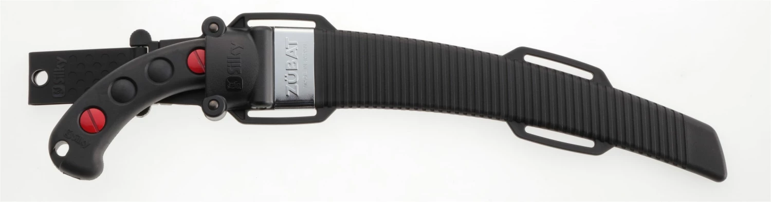 Best-selling, professional, heavy-duty hand saw with a 13-inch, curved, mono-constructed blade. Features rust-resistant, hard chrome-plated, taper-ground curved blade with an impulse-hardened non-set tooth design. Curved blade provides greater cutting speed with less effort. Utilizes proprietary Silky MIRAI-ME (Smooth Cutting) Technology – The Teeth of the Future! The precision-ground, razor-sharp teeth with four cutting angles provide fast, clean and extremely smooth cutting action. The hard chrome-plated blade has 6.5 teeth per inch, resists rust and effects of tree resin, and wipes clean easily. Molded-rubber handle holds the high-performance fast-cutting curved blade that fits securely inside its custom-fitted, pivoting, black polypropylene sheath with detachable belt holder. Great combination of high performance curved blade with a comfortable sure-grip handle that really sticks in your hands. Exceptional design, strength, balance and superior finish quality. Suitable for all pruning tasks and cutting large branches. Made in Japan. ZUBAT is available in five blade lengths: 9-1/2-inch (240 mm), 10-2/3-inch (270 mm), 11-4/5-inch (300 mm), 13-inch (330 mm) and 15-2/5-inch (390 mm).