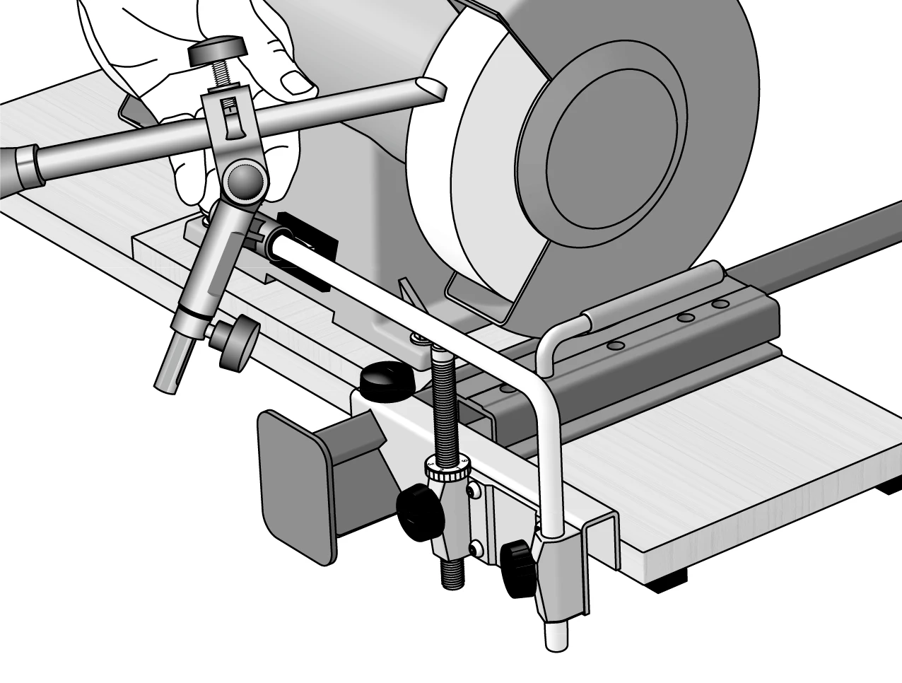 The Tormek Converter Bracket is an attachment for adapting the Tormek BGM-100 Bench Grinder Mounting Kit directly to a Oneway Wolverine Sharpening System v-arm.