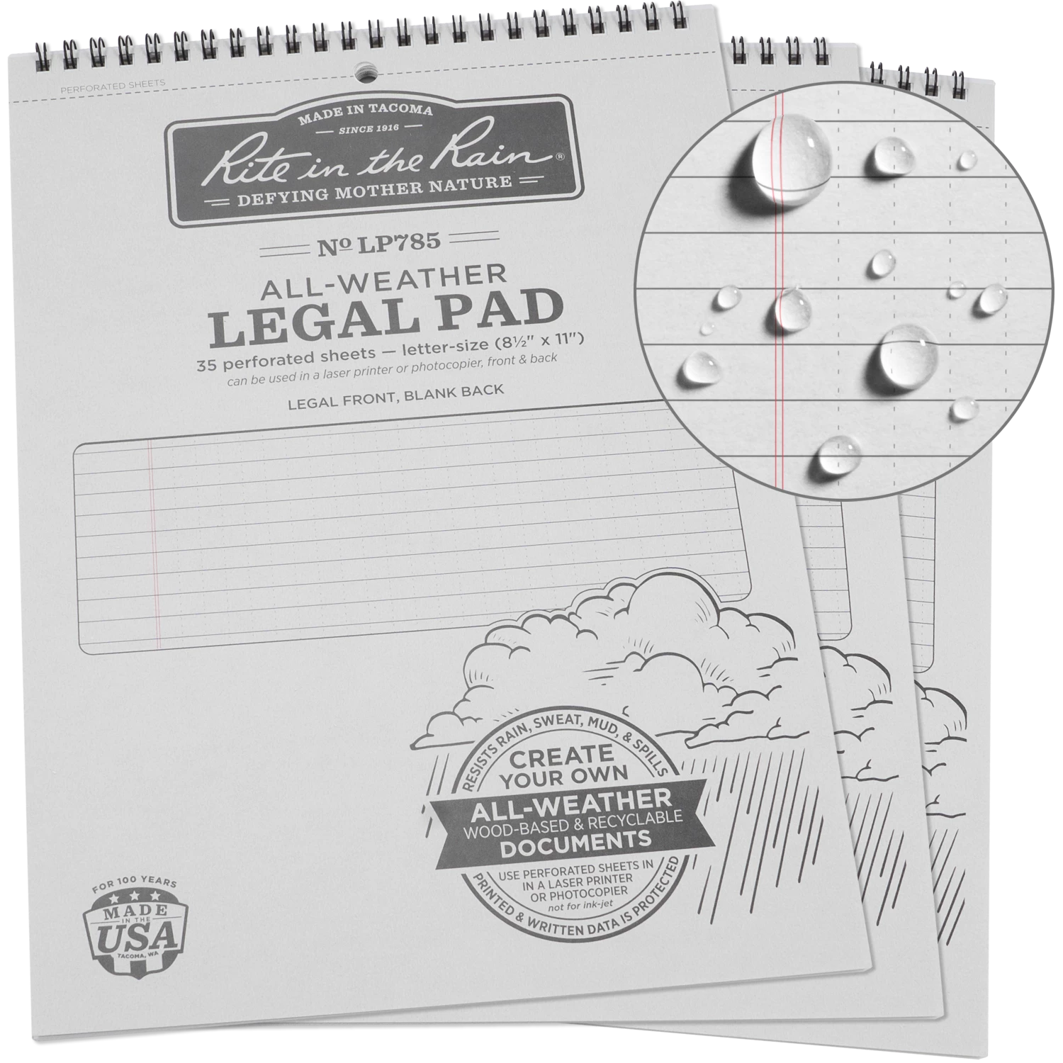 THIS IS A 3 PACK: The Rite in the Rain All-Weather Legal Pad is a durable, dual-purpose pad that protects your documents from time and the elements. A top-spiral binding lays flatter and turns easier than a traditional legal pad’s binding. The grey-tinted pages reduce glare and make for pleasant and professional experience – forget Canary Yellow. The front of each sheet has our Universal Page Pattern for handwritten notes. Each sheet is also perforated for clean, easy removal, and the back of each sheet is left blank so that it can be run through a laser printer. No matter what you write or print on the Rite in the Rain All-Weather Legal Pad, your notes and documents will be safe from harm.