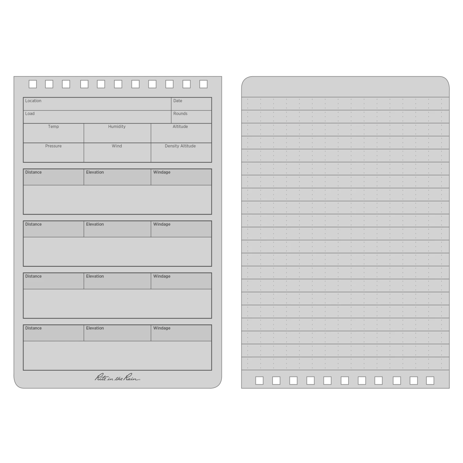 Save your D.O.P.E. notes from whether or an accidental wash cycle with Rite in the Rain weatherproof paper. This pocketable rifle data logbook tracks all of your essential notes and protects it from the elements. Our simple design has been distilled down to include only essential ballistic and environmental data so you can quickly find the DOPE page matching your shooting conditions. Helpful reference material assists in accounting for wind effect and converting between common units. MOA and MRAD rulers printed onto the front and back covers help you zero and score your groups. A wind factor visualization helps accurately account for off-axis winds. Rifle shooters of all skill levels can use this book to track and protect their essential ballistic data in the field – no matter the weather.